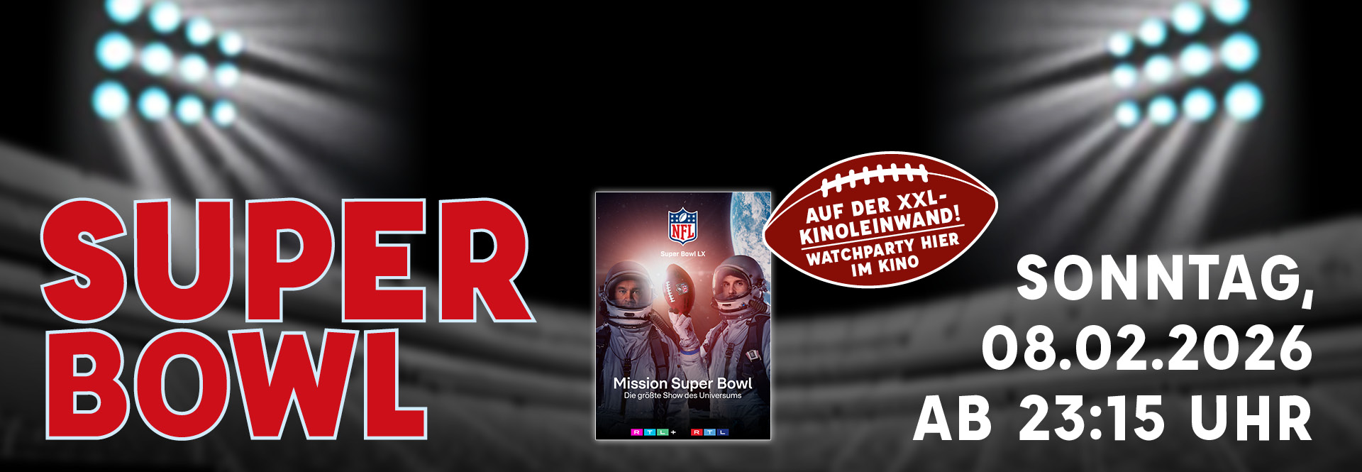 Wir bringen den NFL Super Bowl dorthin, wo er hingehört – auf die XXL-Kinoleinwand! Mit dem passenden Sound für das Game und die Halftime Show.
